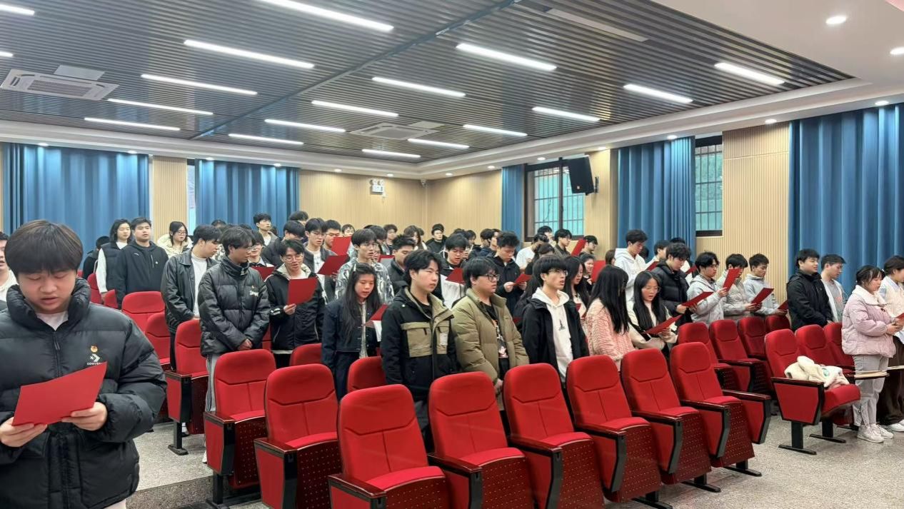 为深入学习贯彻党的二十届四中全会精神,巩固拓展学习贯彻习近平新时代中国特色社会主义思想主题教育成果,严格落实校党委组织部工作部署,2025年11月27日,学院学生党支部在莲塘校区多功能报告厅组织召开“学习全会精神 凝聚奋进力量”主题党日活动。我院党总支书记王培玉、副院长熊勇军、支部全体党员、入党积极分子及莲塘校区各班级团员代表共计150余人参加活动。