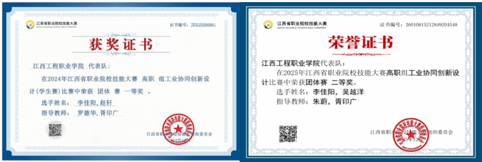 他深知 “实践是检验真理的唯一标准”,将专业竞赛与实训项目作为提升能力的重要载体。在专业实训中,专注零件加工、协同设计等实操内容,锤炼数控编程、三维建模等技能,将课堂所学转化为解决实际问题的硬实力。积极参与江西省职业院校技能大赛,与队友携手斩获高职组工业协同创新设计(学生赛)团体一等奖及二等奖。
