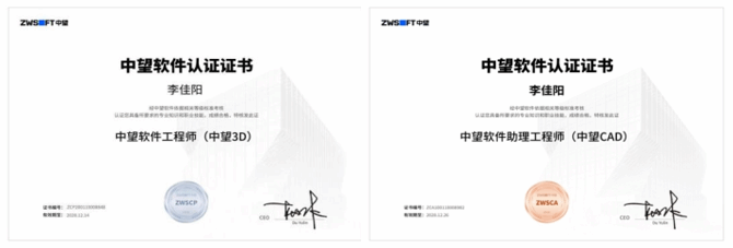 学业上,李佳阳始终以高标准严苛要求自己,掌握CAD 中望等软件操作、数控加工工艺、产品数字化设计等专业技能,将严谨细致的态度融入每一次知识钻研与技能练习,凭借优异的学业表现斩获国家励志奖学金,为专业发展筑牢根基。他注重理论与实践的深度融合,主动考取中望软件工程师(中望3D),中望软件助理工程师(中望CAD)认证,以行业标准校准自身技能,不断提升专业适配度与竞争力。
